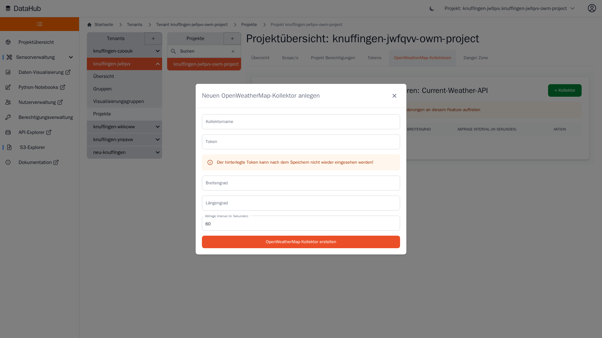 Wetterdaten der Current-Weather-API können mit wenigen Schritten in die Plattform integriert werden. Hierfür können "OWM-Kollektoren" eingerichtet werden, die in selbstkonfigurierbaren Intervallen Wetterdaten von der Current-Weather-API abfragen und an die Plattform senden.