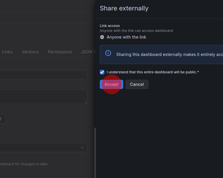 Es öffnet sich eine Seitenleiste, bei der noch einmal bestätigt werden muss, dass das Dashboard für alle Personen mit dem entsprechenden Link einsehbar sein soll: